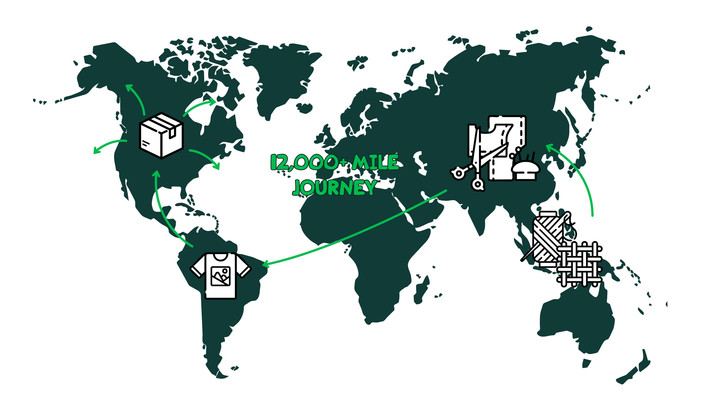 Traditionally, thread is woven in Malaysia or Indonesia, then imported to China to be cut and sewn, then shipped to Mexico or Central America to be decorated, then shipped back out to the consumer.